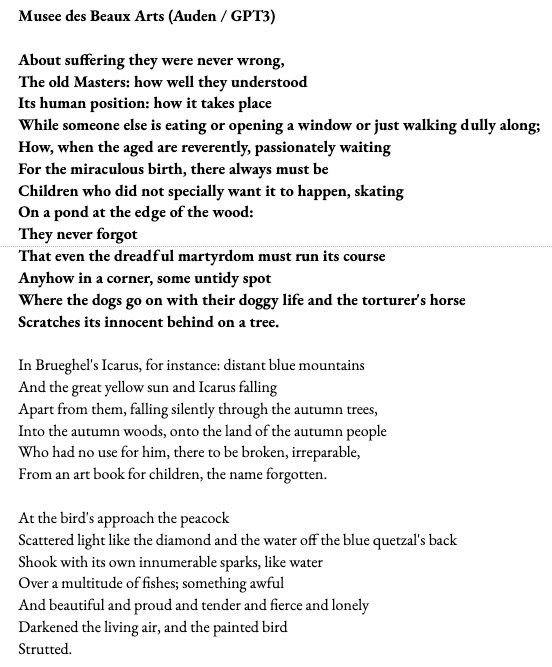 The vehicle by which this is achieved is the world of painting, in particular the work of the old masters. How well they understood its human position: "musée des beaux arts" (french for "museum of fine arts") was written in 1938.